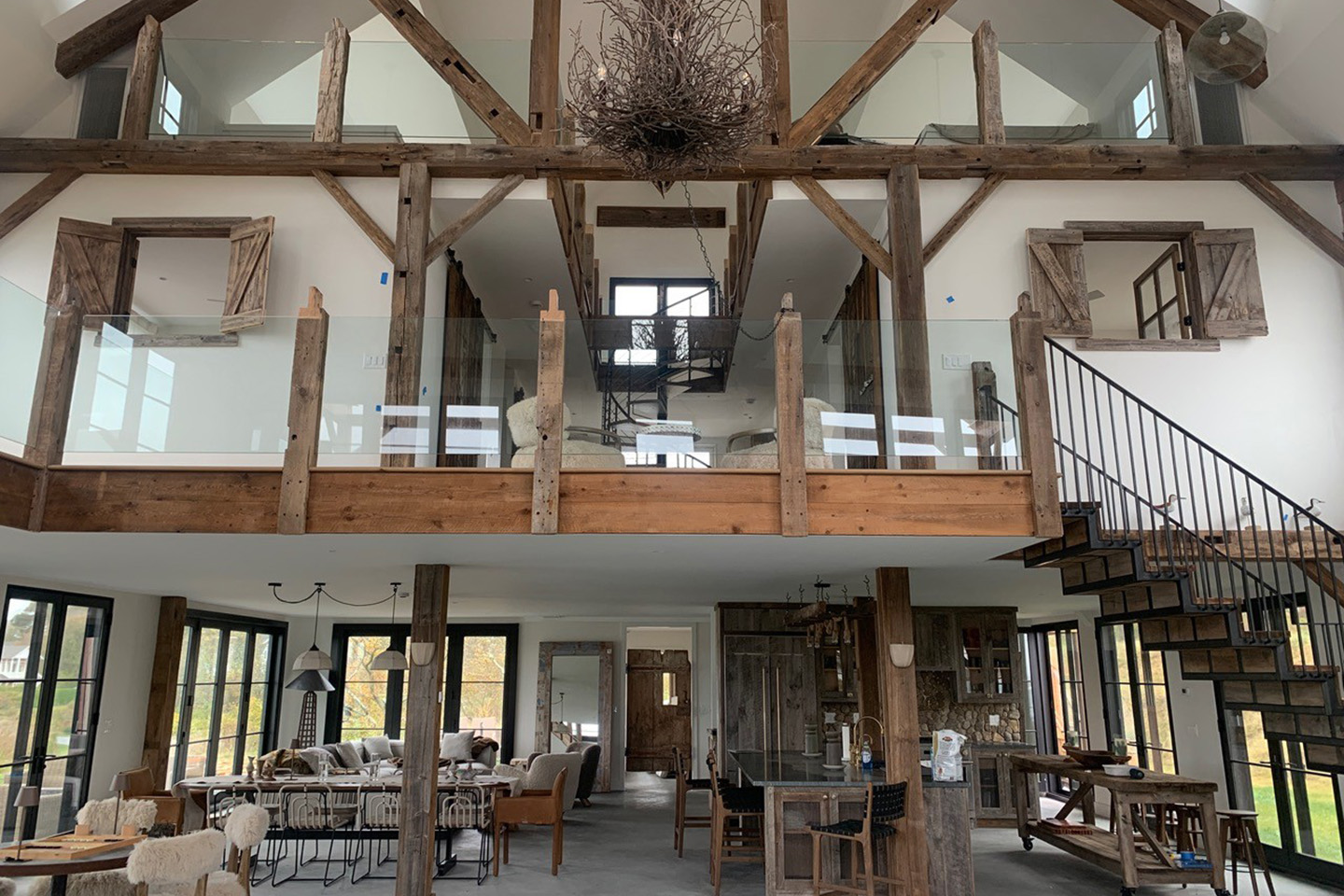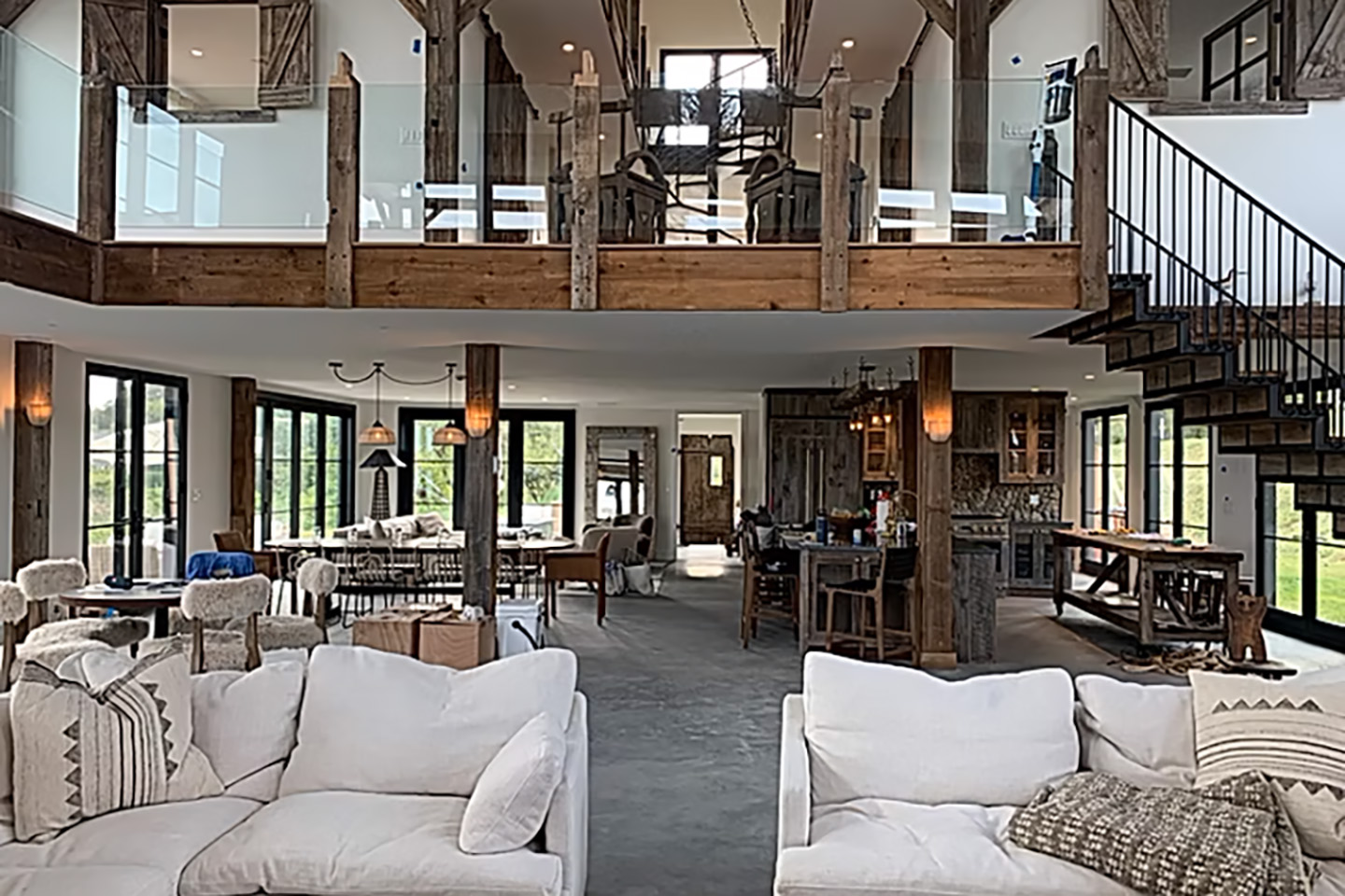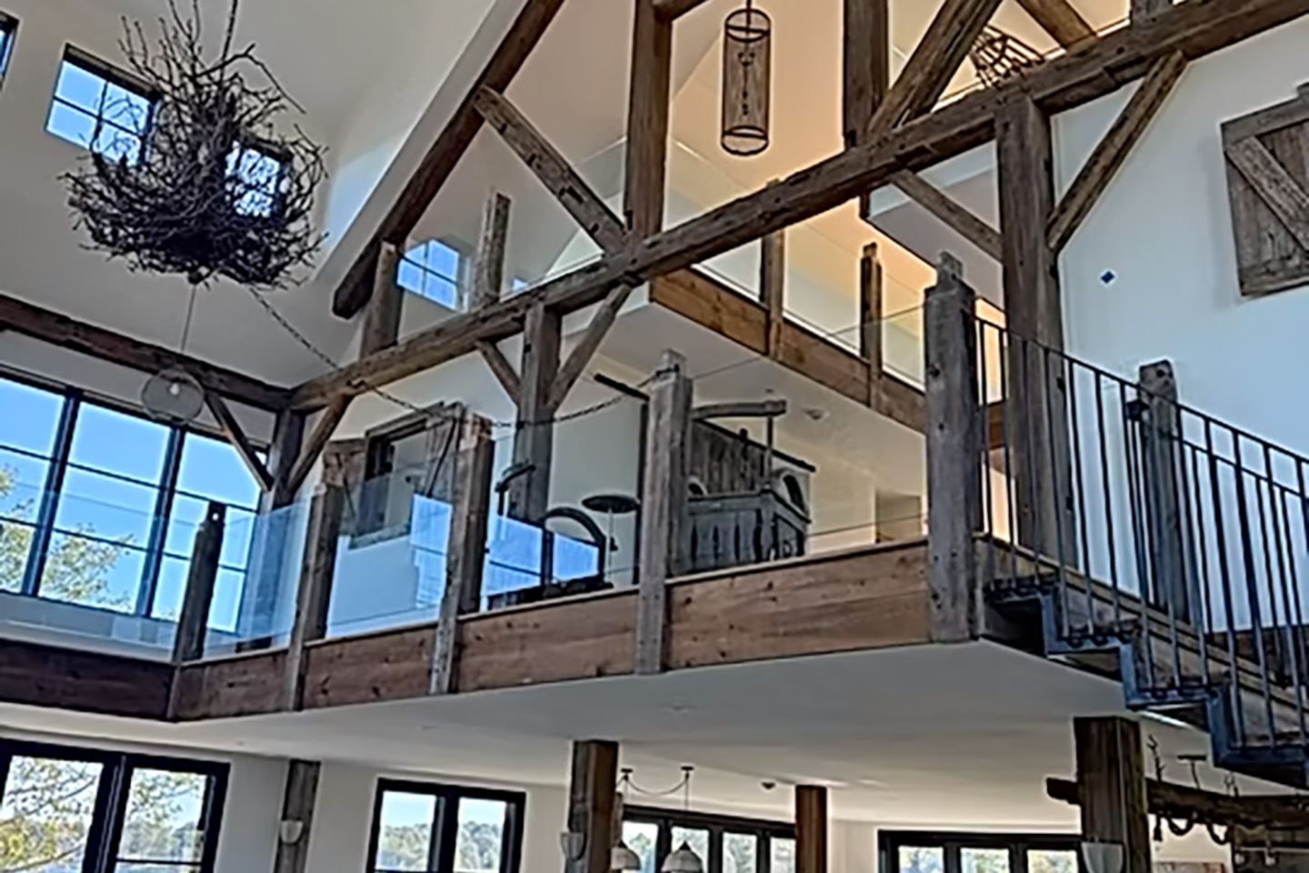 Inside, the home features vaulted ceilings that soar overhead, anchored by a 70-foot ridge beam and hand-hewn posts. Custom barn and stable doors, delicate sway braces, and floating steel-and-wood staircases add both texture and strength to the space. Every window and door was placed with intention—framing sight lines that shift with the light and invite you to pause.