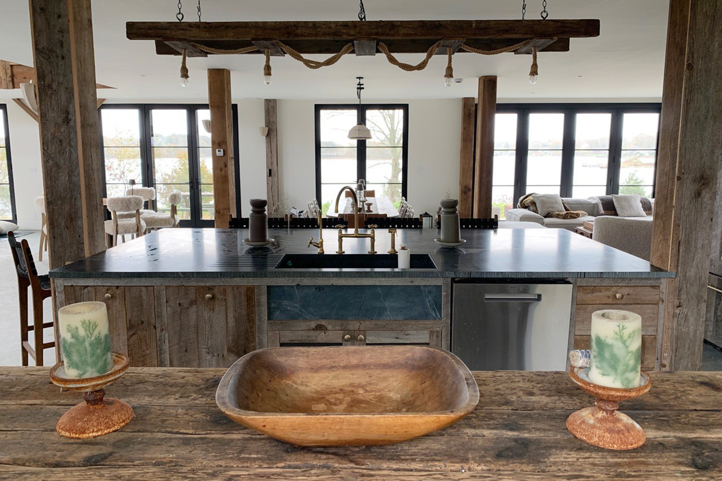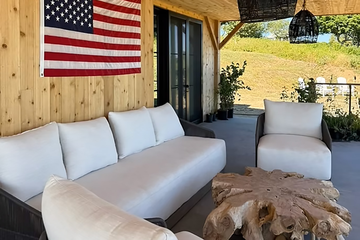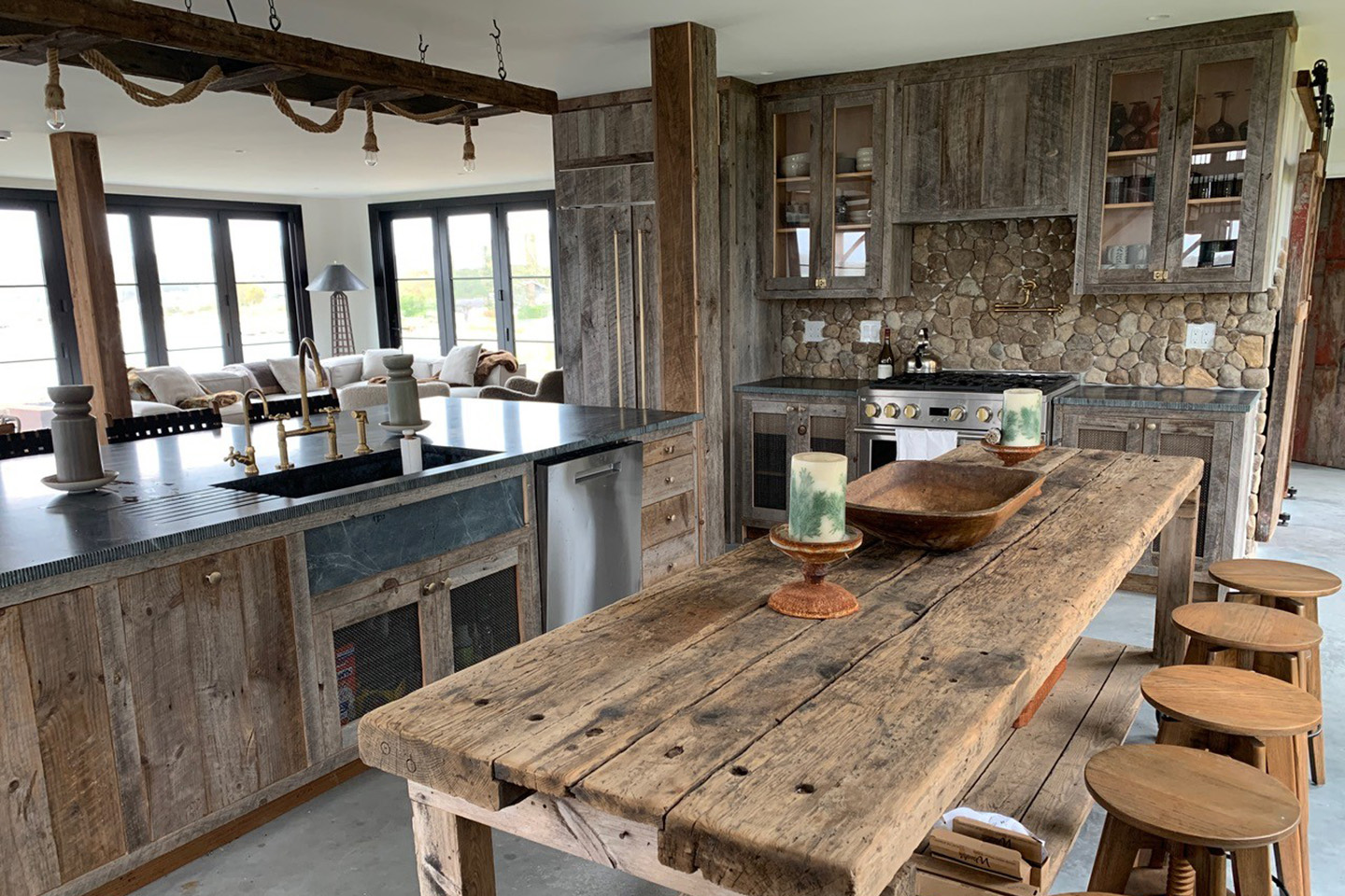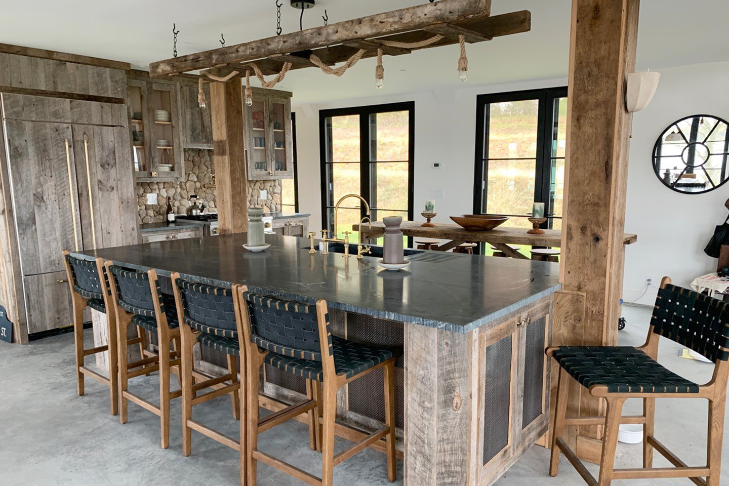Inside, the home features vaulted ceilings that soar overhead, anchored by a 70-foot ridge beam and hand-hewn posts. Custom barn and stable doors, delicate sway braces, and floating steel-and-wood staircases add both texture and strength to the space. Every window and door was placed with intention—framing sight lines that shift with the light and invite you to pause.