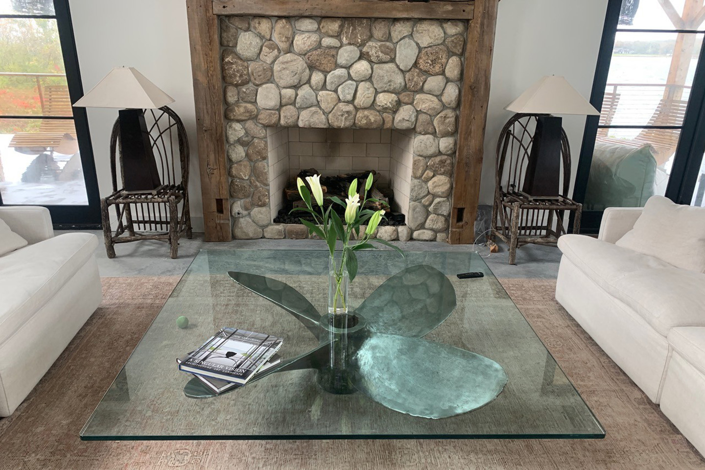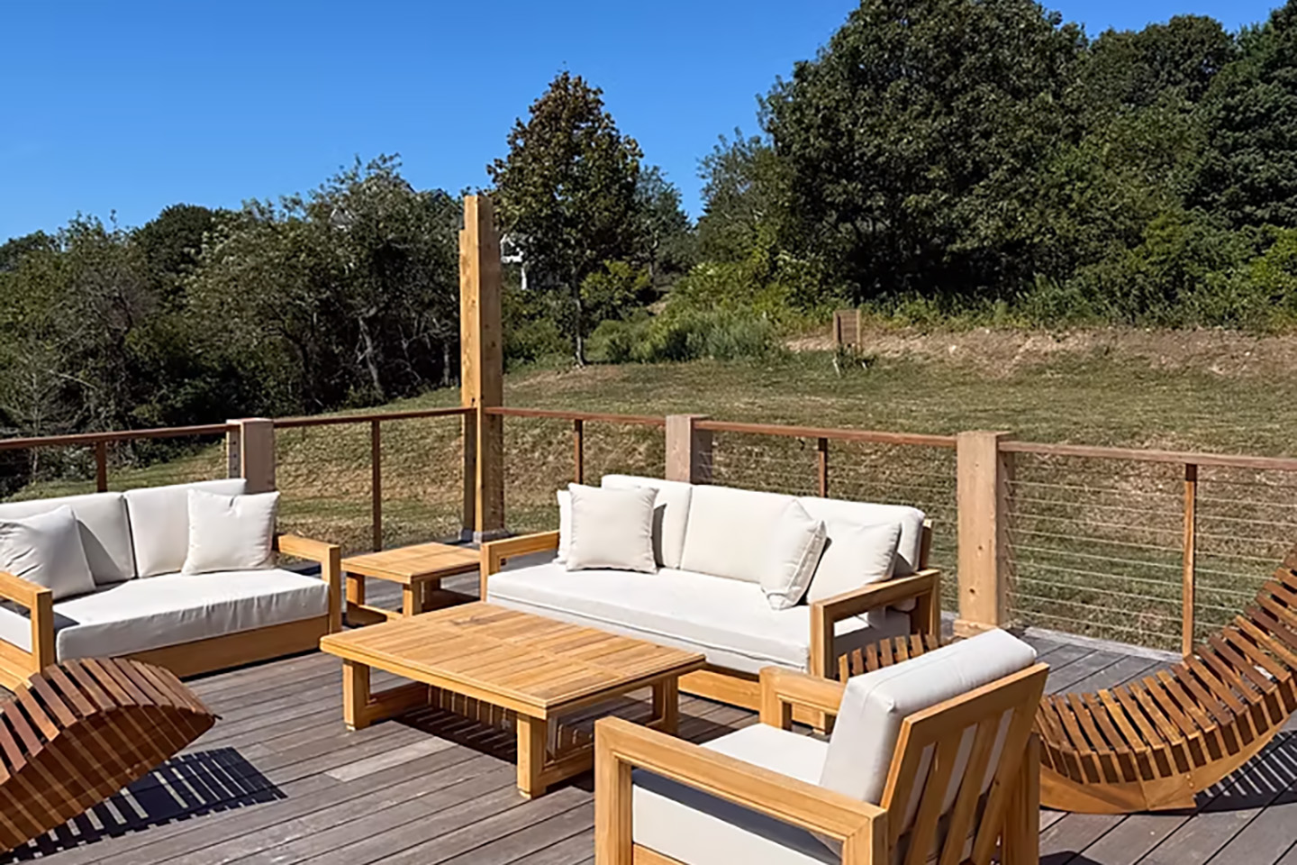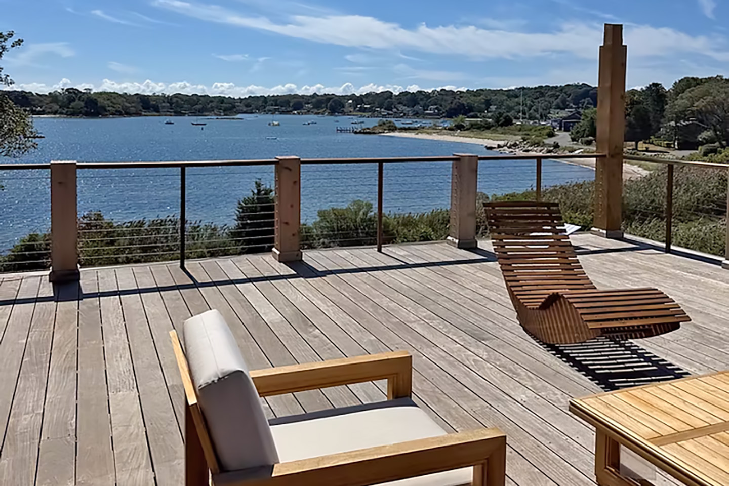 From the moment you arrive, the landscape unfolds. Two sweeping acres are designed with stone patios, seating areas, fire pits, and a sprawling lawn that leads to three expansive Ipe balconies. Each space offers a unique view of the harbor, the Sound, the distant Connecticut shoreline and the colorful western sunsets. The sense of expanse, inside and out, is immediate.