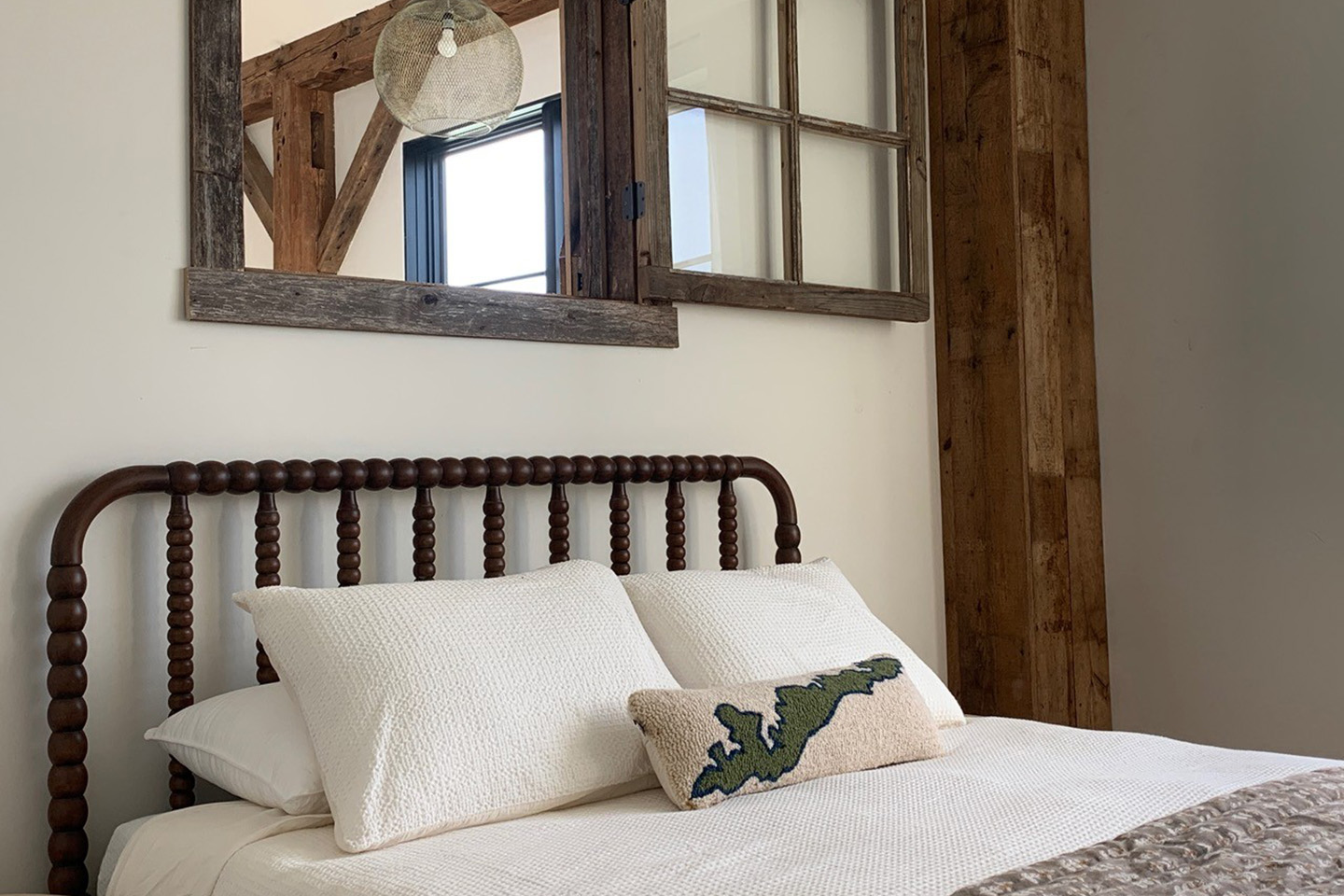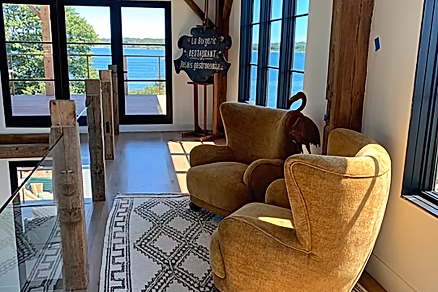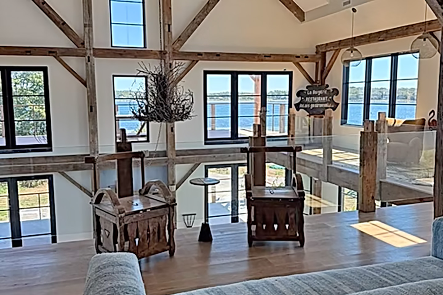 Upstairs, known as The Loft, the reclaimed barn doors and post and glass railings on the catwalk branch into either the "upper balcony", with views that go on for miles, or four water view bedrooms and two bathrooms, each joined by cozy gathering spaces, and an elevated rear deck.