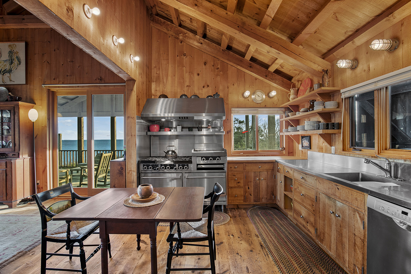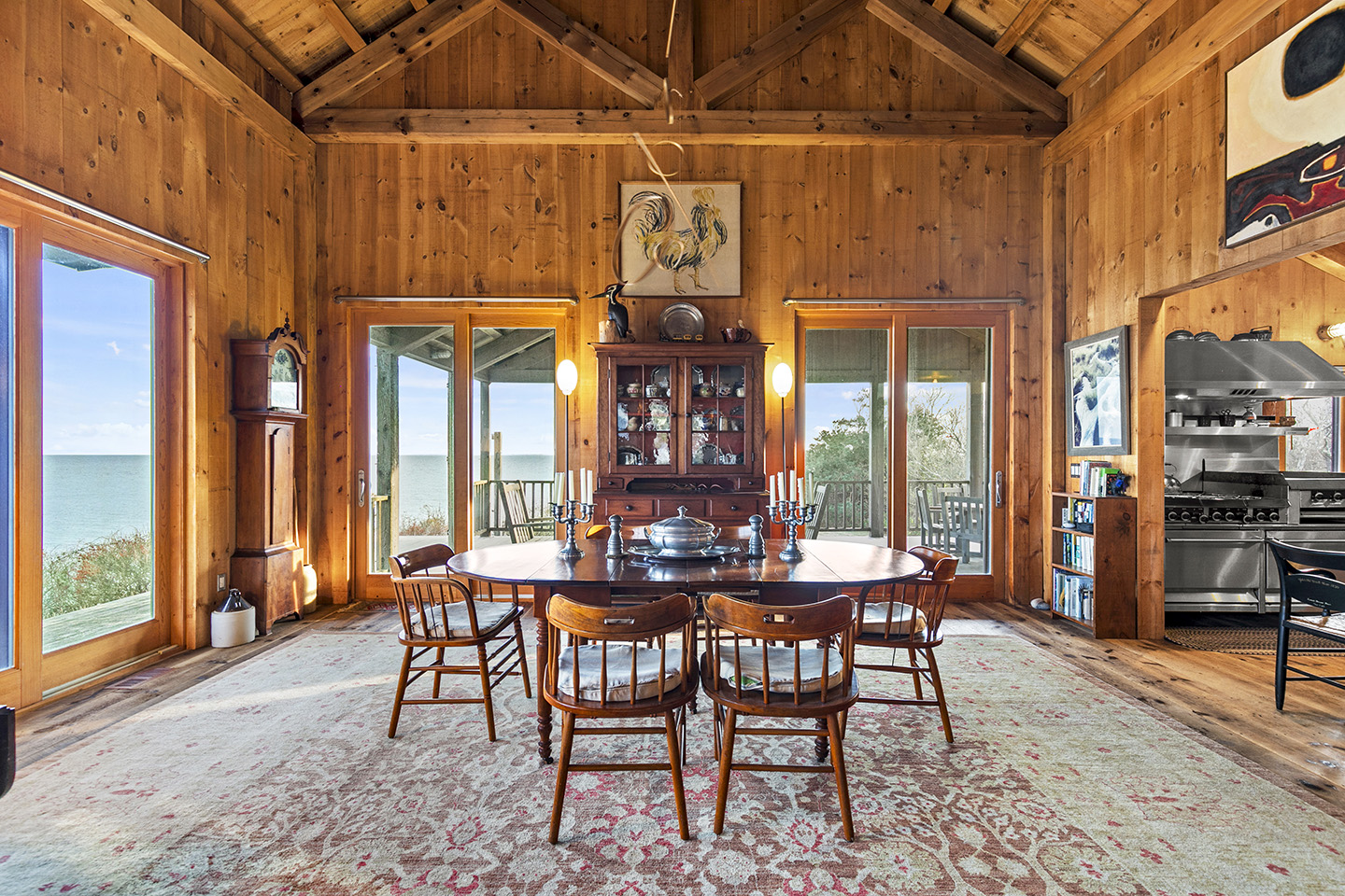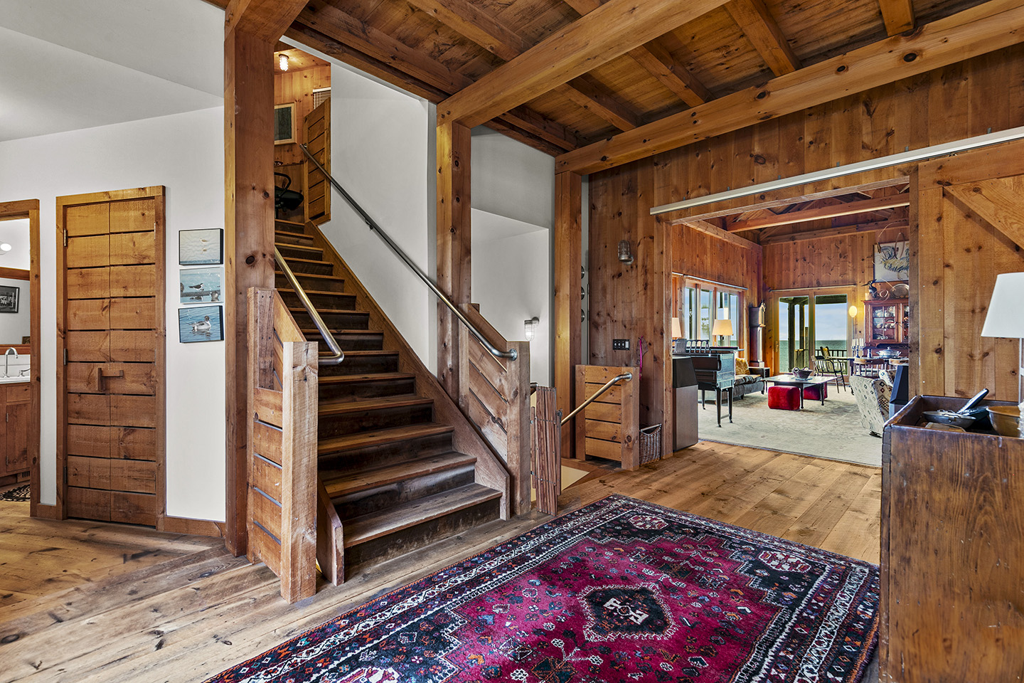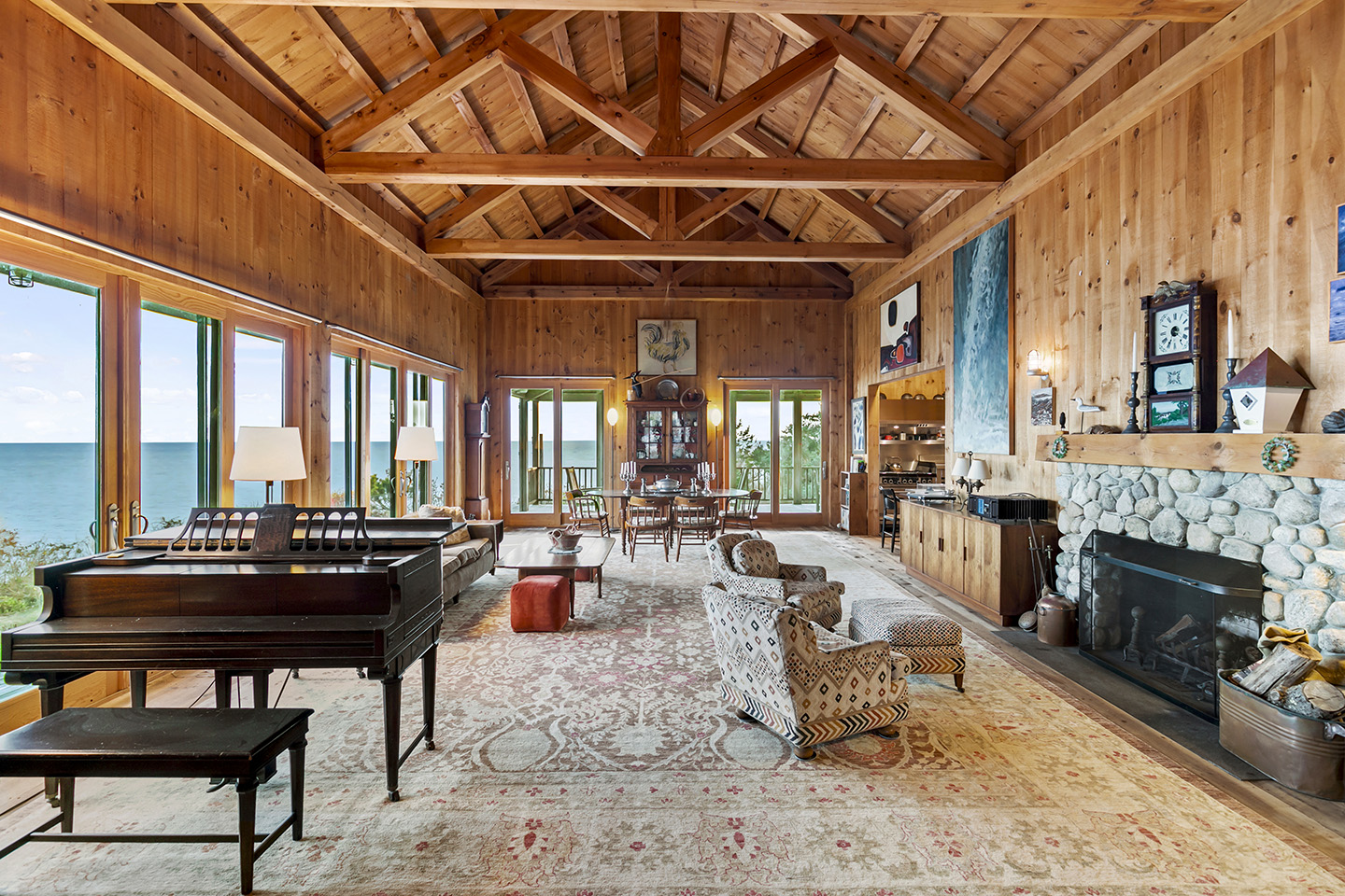 The open concept interior is unique and spacious with rustic pine paneling, barn flooring and built-ins throughout, featuring a warm and inviting sun filled great room with exposed beams and trusses, stone fireplace, and glass doors that allow the natural surroundings to flow seamlessly into the room– you can step out onto the wrap around deck or the large screened porch to enjoy additional outdoor living spaces. The low maintenance, and comfortable unfinished floors were designed to be easy to care for and practical- warm under foot in the fall and winter, cool in the summer. The main house boasts 5 bedrooms, 4 1/2 baths, eat-in kitchen that is a fun space to cook in, pantry, library, office, bonus room, wine cellar, and additional private nooks for quiet relaxation – there is ample space for gracious living and entertaining.