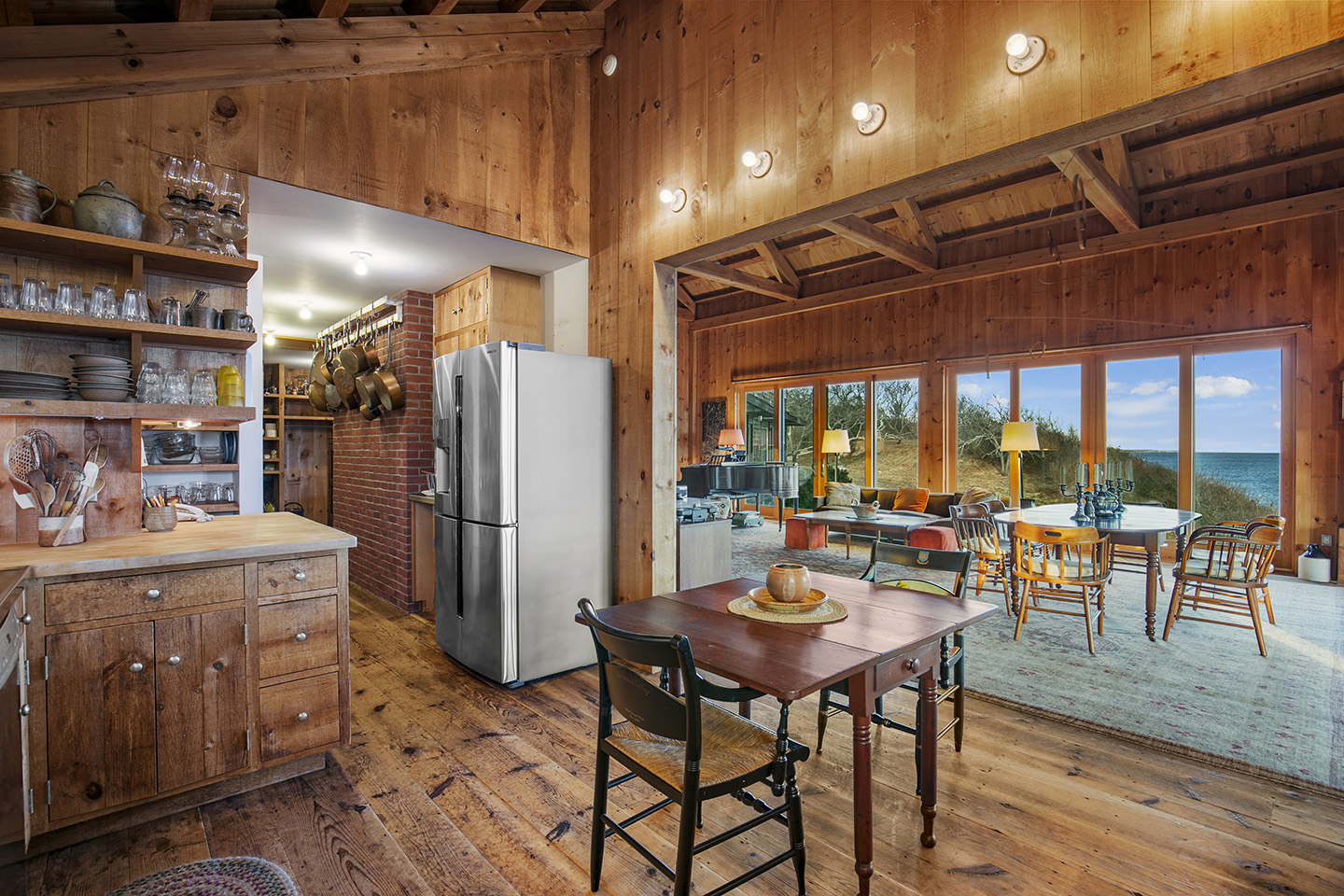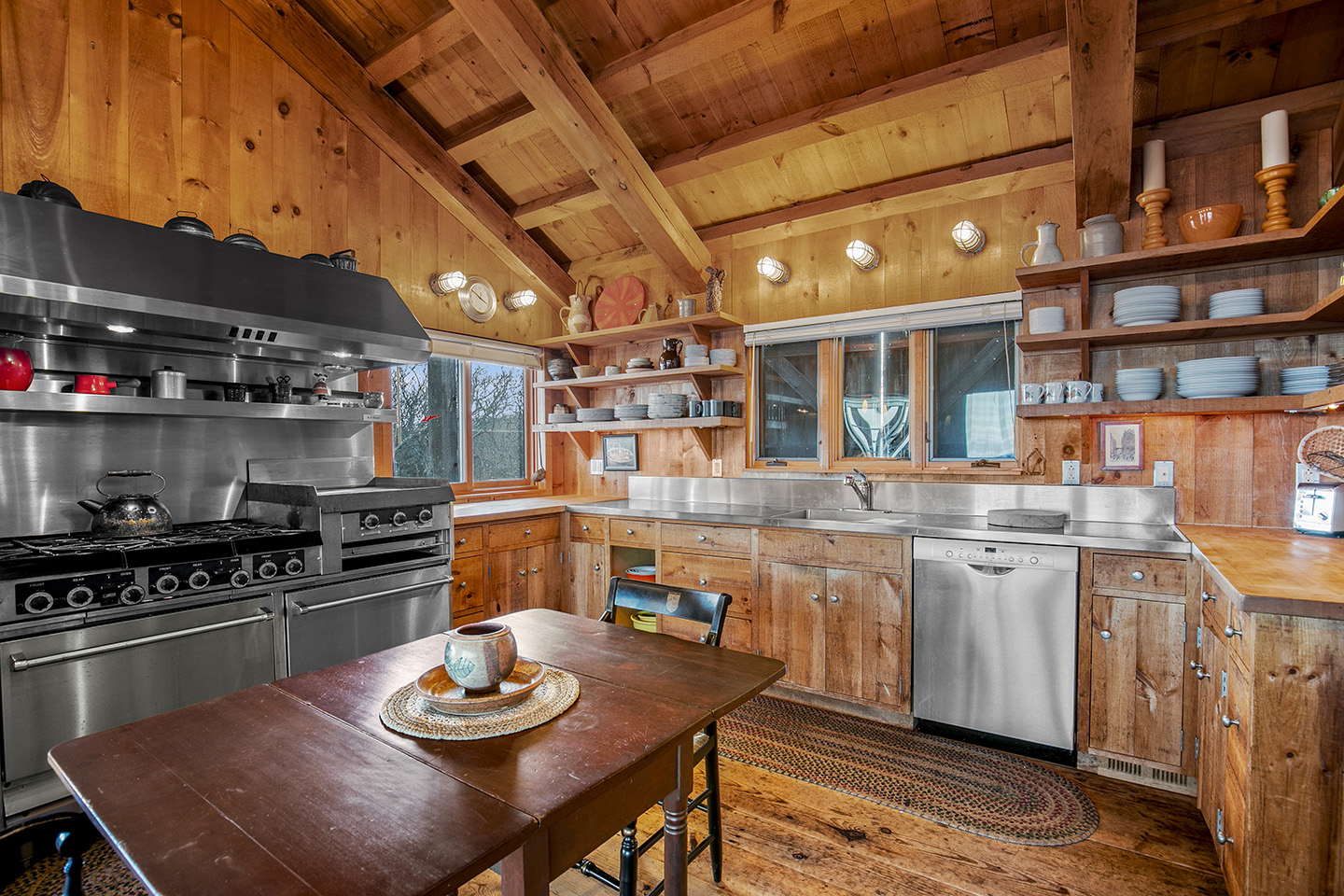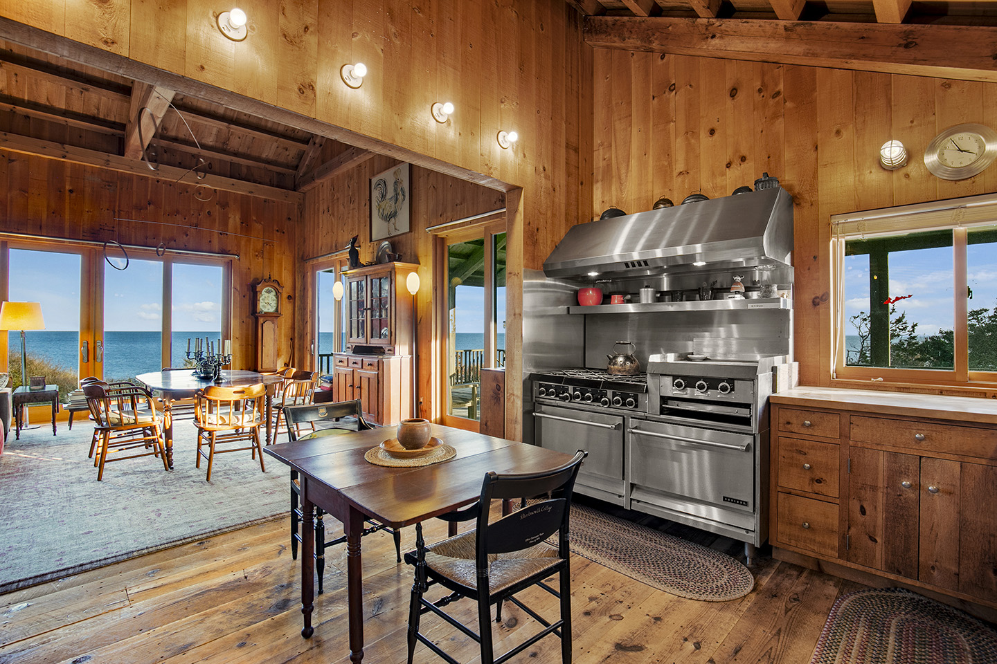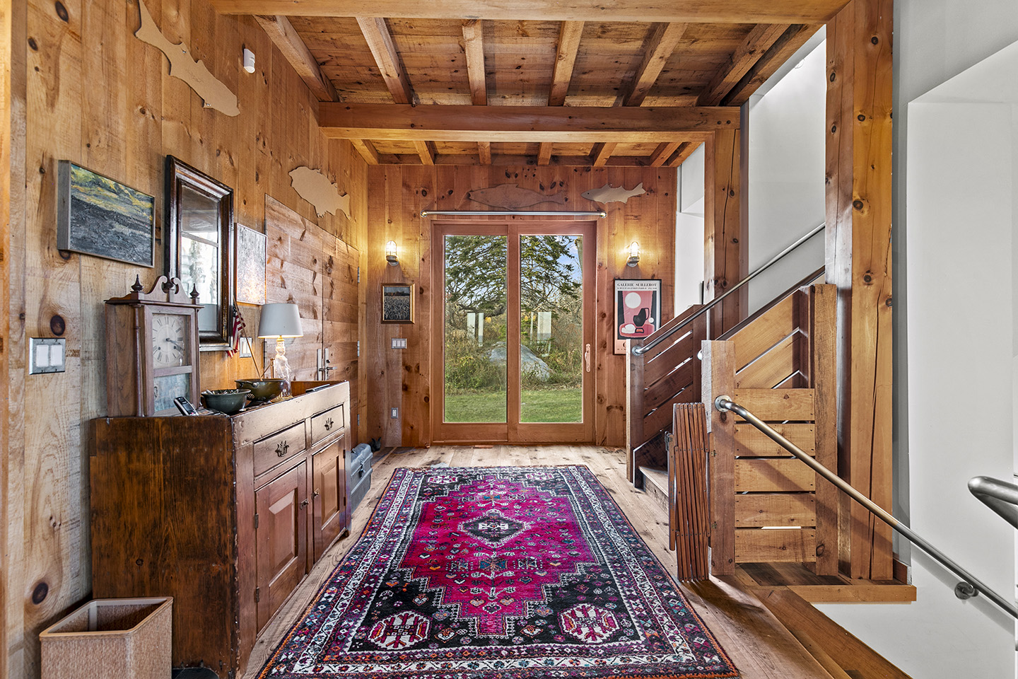 The open concept interior is unique and spacious with rustic pine paneling, barn flooring and built-ins throughout, featuring a warm and inviting sun filled great room with exposed beams and trusses, stone fireplace, and glass doors that allow the natural surroundings to flow seamlessly into the room– you can step out onto the wrap around deck or the large screened porch to enjoy additional outdoor living spaces. The low maintenance, and comfortable unfinished floors were designed to be easy to care for and practical- warm under foot in the fall and winter, cool in the summer. The main house boasts 5 bedrooms, 4 1/2 baths, eat-in kitchen that is a fun space to cook in, pantry, library, office, bonus room, wine cellar, and additional private nooks for quiet relaxation – there is ample space for gracious living and entertaining.