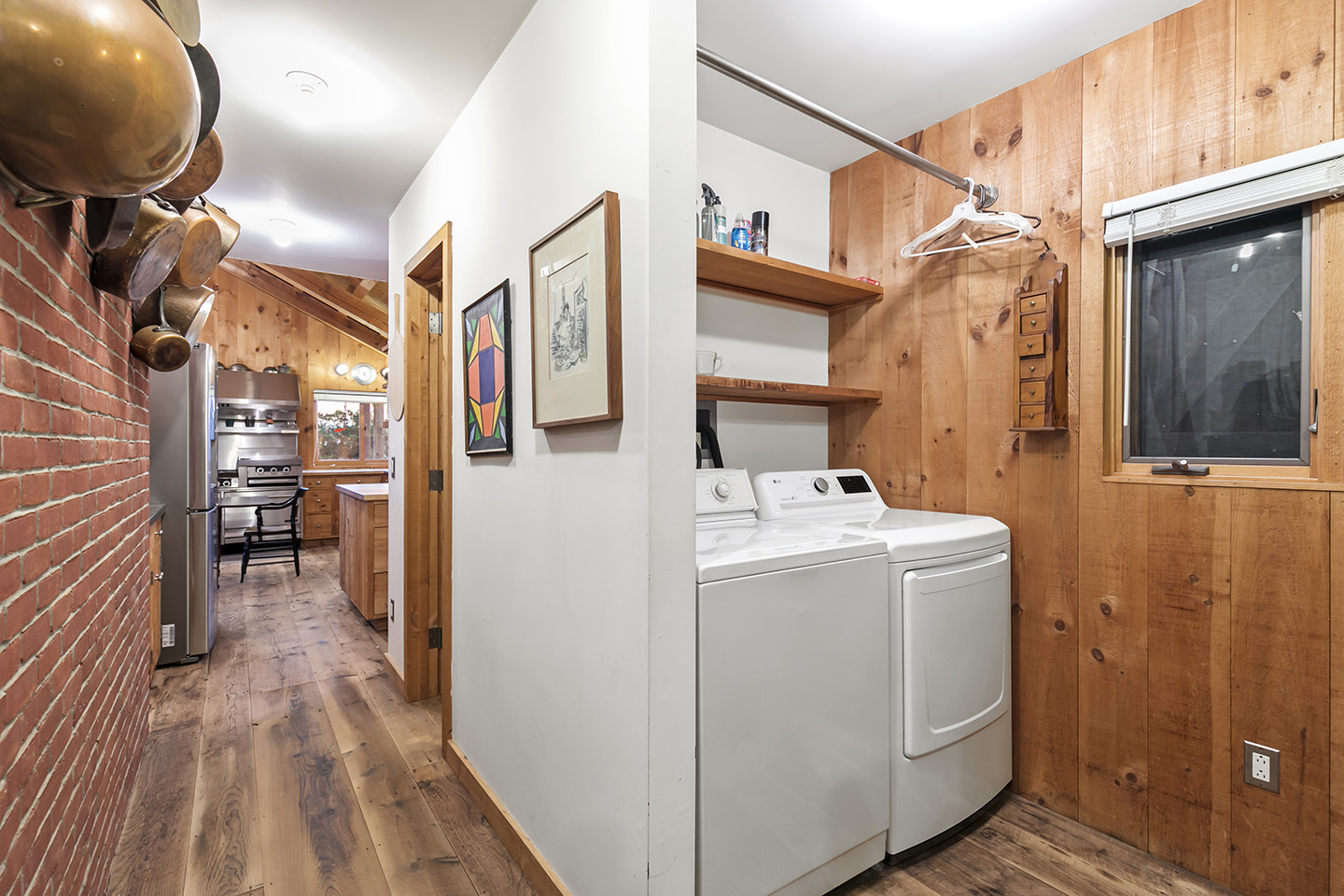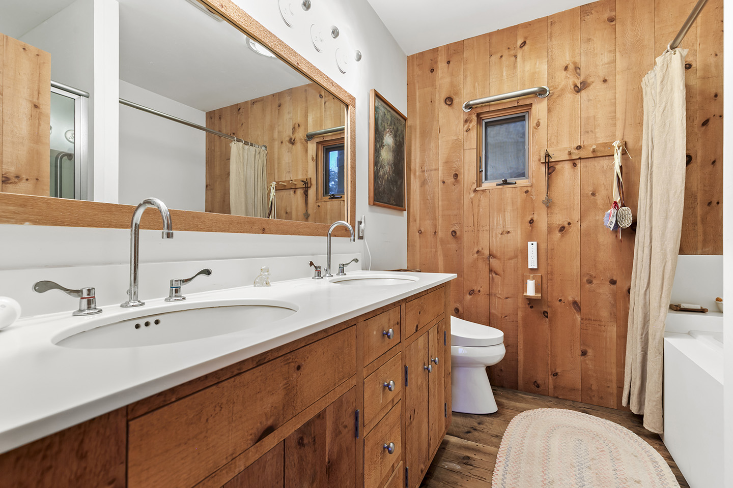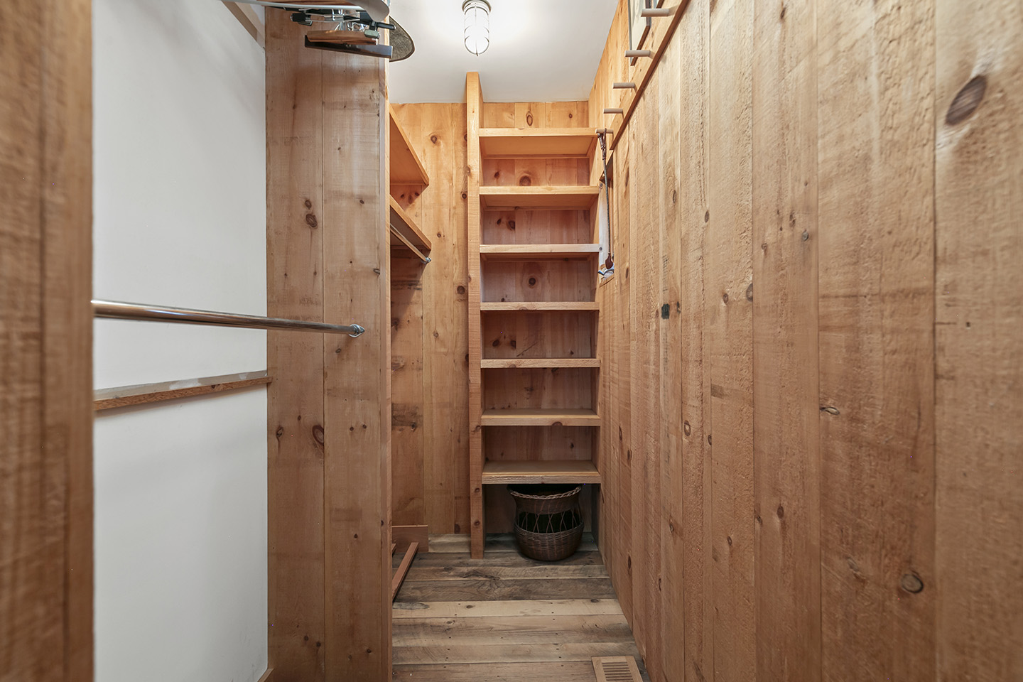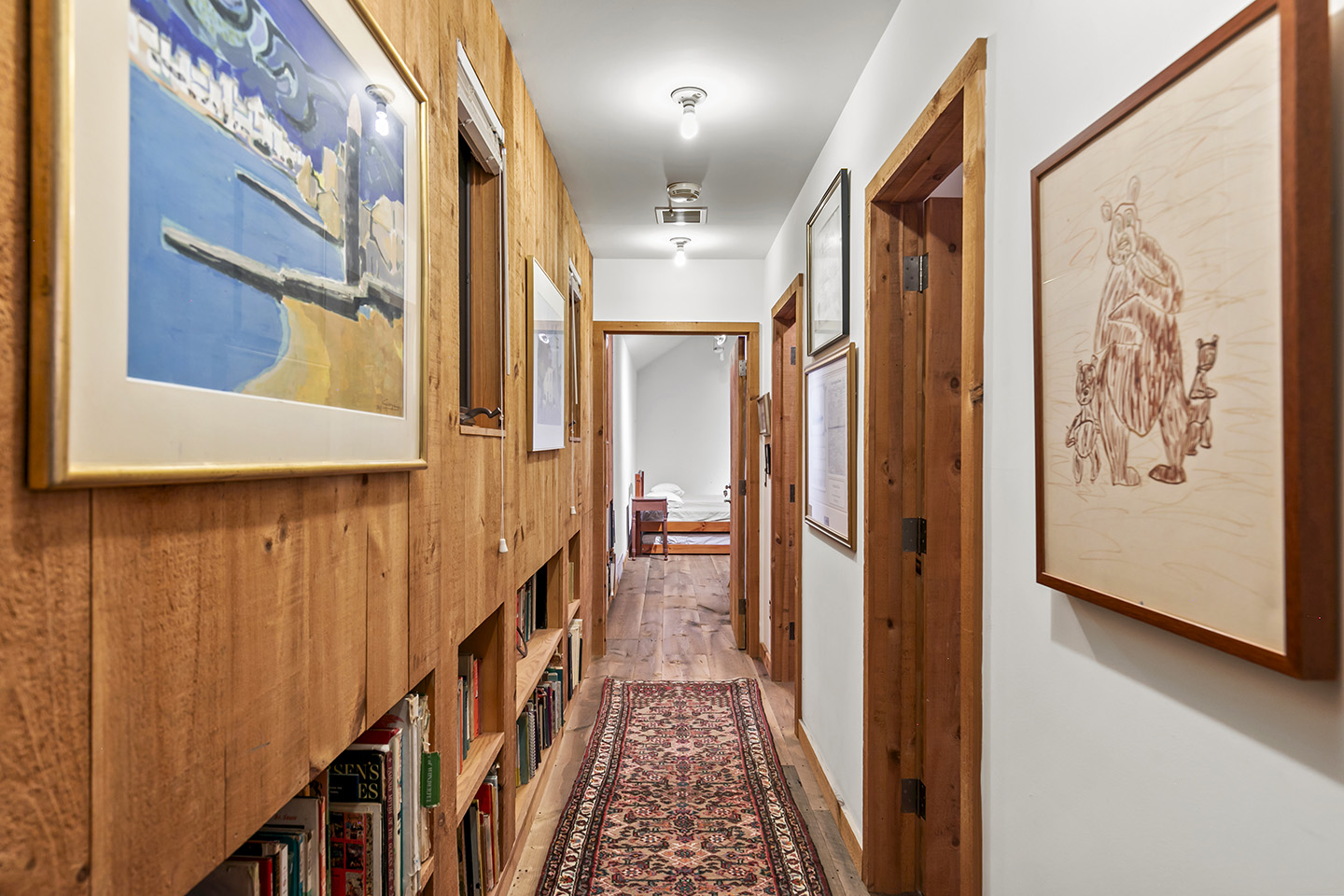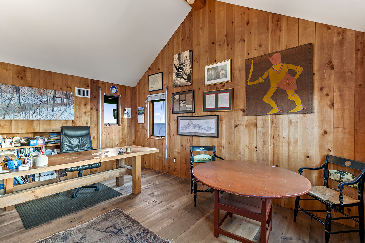 The open concept interior is unique and spacious with rustic pine paneling, barn flooring and built-ins throughout, featuring a warm and inviting sun filled great room with exposed beams and trusses, stone fireplace, and glass doors that allow the natural surroundings to flow seamlessly into the room– you can step out onto the wrap around deck or the large screened porch to enjoy additional outdoor living spaces. The low maintenance, and comfortable unfinished floors were designed to be easy to care for and practical- warm under foot in the fall and winter, cool in the summer. The main house boasts 5 bedrooms, 4 1/2 baths, eat-in kitchen that is a fun space to cook in, pantry, library, office, bonus room, wine cellar, and additional private nooks for quiet relaxation – there is ample space for gracious living and entertaining.