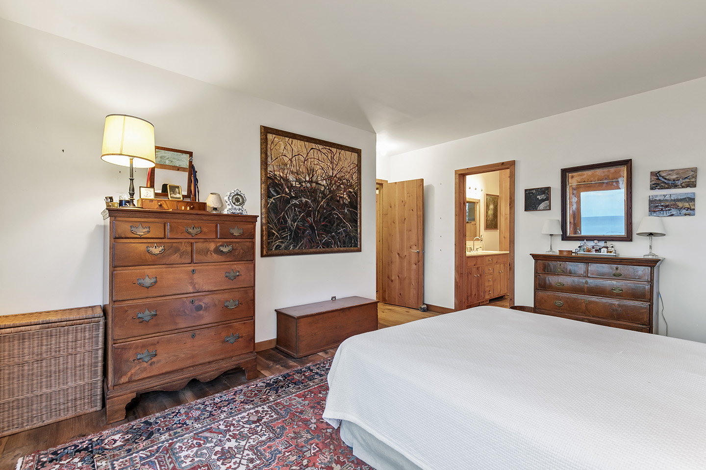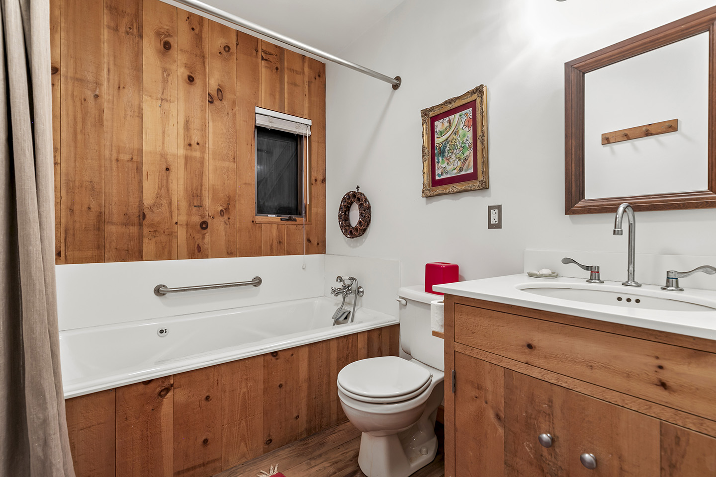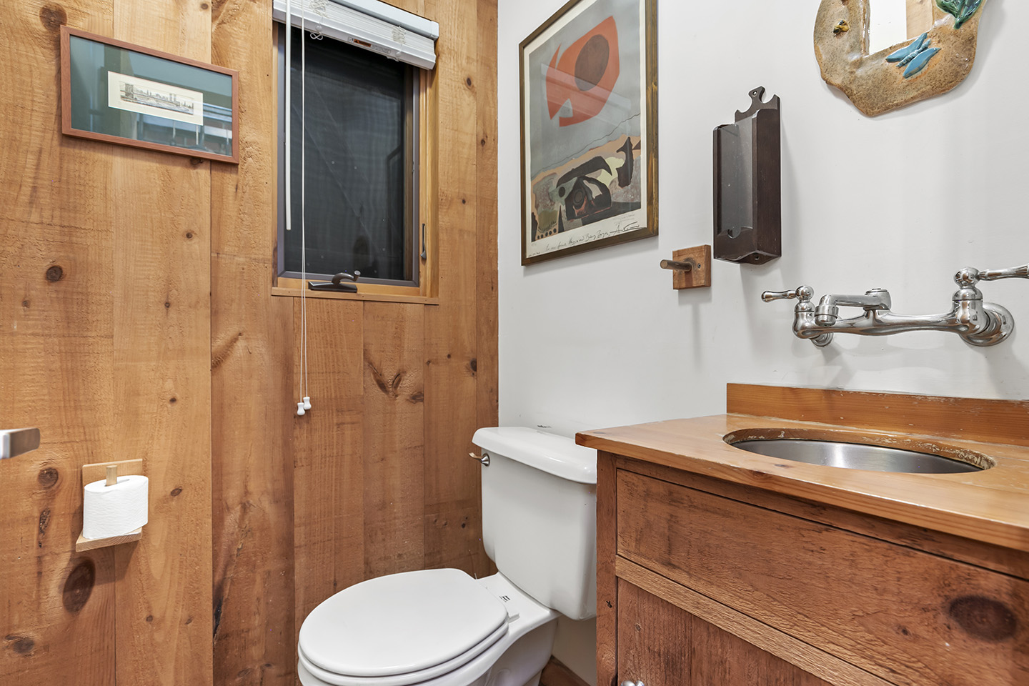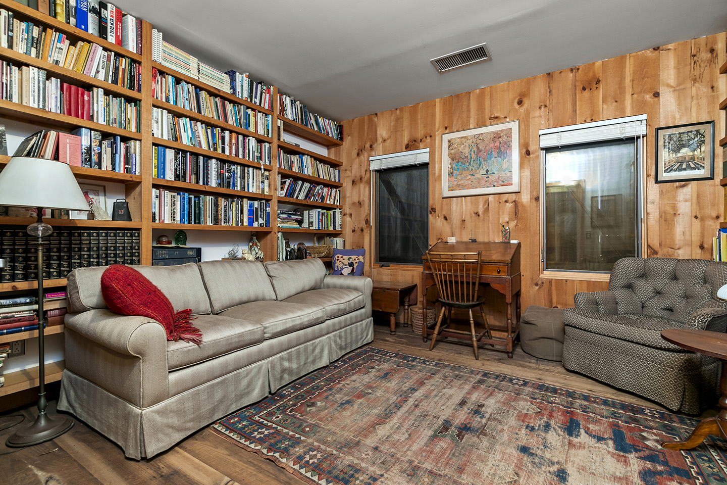The open concept interior is unique and spacious with rustic pine paneling, barn flooring and built-ins throughout, featuring a warm and inviting sun filled great room with exposed beams and trusses, stone fireplace, and glass doors that allow the natural surroundings to flow seamlessly into the room– you can step out onto the wrap around deck or the large screened porch to enjoy additional outdoor living spaces. The low maintenance, and comfortable unfinished floors were designed to be easy to care for and practical- warm under foot in the fall and winter, cool in the summer. The main house boasts 5 bedrooms, 4 1/2 baths, eat-in kitchen that is a fun space to cook in, pantry, library, office, bonus room, wine cellar, and additional private nooks for quiet relaxation – there is ample space for gracious living and entertaining.